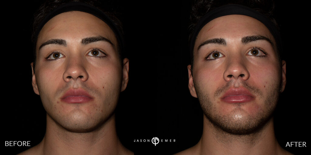 Julian had always wanted to that extra “pop” in his lips while also plumping, shaping since his lips were bigger on one side than the other. His lower lip also had less volume than his upper lip, which goes against the golden rule of lip aesthetics, which is that the lower lip must have slightly more volume than the upper lip. Using Restylane Defyne, a honey-like hyaluronic acid-based filler, known for giving a very natural and kissable result, Dr. Emer meticulously injected the filler using a pillar technique to shape the borders of the upper lip and volumize the lower lip to give Julian the perfect pout.